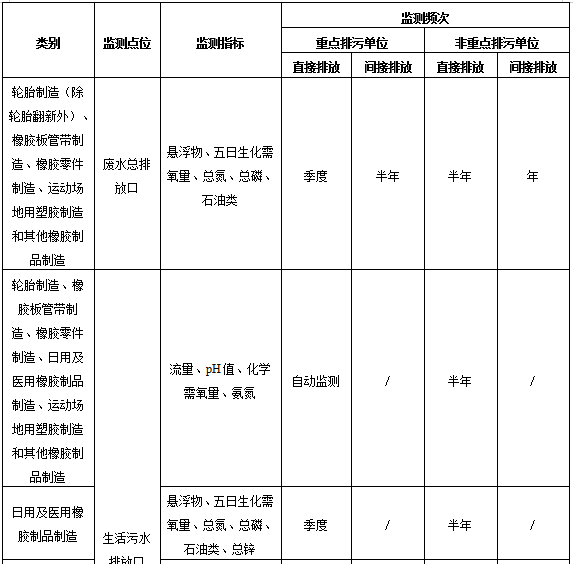 橡膠制品工業排污單位廢水排放監測點位、監測指標及最低監測頻次按照表1執行。