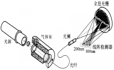光源發(fā)出的紫外光通過(guò)光纖傳輸?shù)綔y(cè)量室,測(cè)量室樣氣在特定波段吸收紫外光譜能量,被吸收后的光束通過(guò)光纖傳輸?shù)焦庾V儀,在光譜儀內(nèi)部經(jīng)過(guò)光柵分光,由二極管陣列檢測(cè)器將分光后的光信號(hào)轉(zhuǎn)換為電信號(hào),獲得氣體的連續(xù)吸收光譜信息,最后根據(jù)特定算法計(jì)算待測(cè)氣體濃度。其結(jié)構(gòu)示意圖如下: