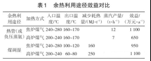 由于焦?fàn)t加熱用煤氣種類的不同,焦?fàn)t煙道廢氣余熱利用的溫度差別很大,以年產(chǎn)120萬(wàn)t焦炭的焦?fàn)t煙道廢氣利用熱管技術(shù)生產(chǎn)蒸汽(或負(fù)壓蒸氨)和煤調(diào)濕技術(shù)進(jìn)行對(duì)比,對(duì)比結(jié)果見(jiàn)表1。